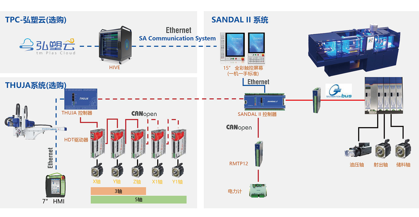 全新的 SANDALII 方案全方位整合機(jī)械手與輔機(jī)設(shè)備的標(biāo)準(zhǔn)通訊,在 SA Communication System 通訊標(biāo)準(zhǔn)基礎(chǔ)上,配合 TM Edge Server 和 TM PLAS CLOUD 平臺(tái),完美整合一機(jī)一手一系統(tǒng)架構(gòu),也為未來工業(yè) 4.0 的智能制造打好基礎(chǔ)。